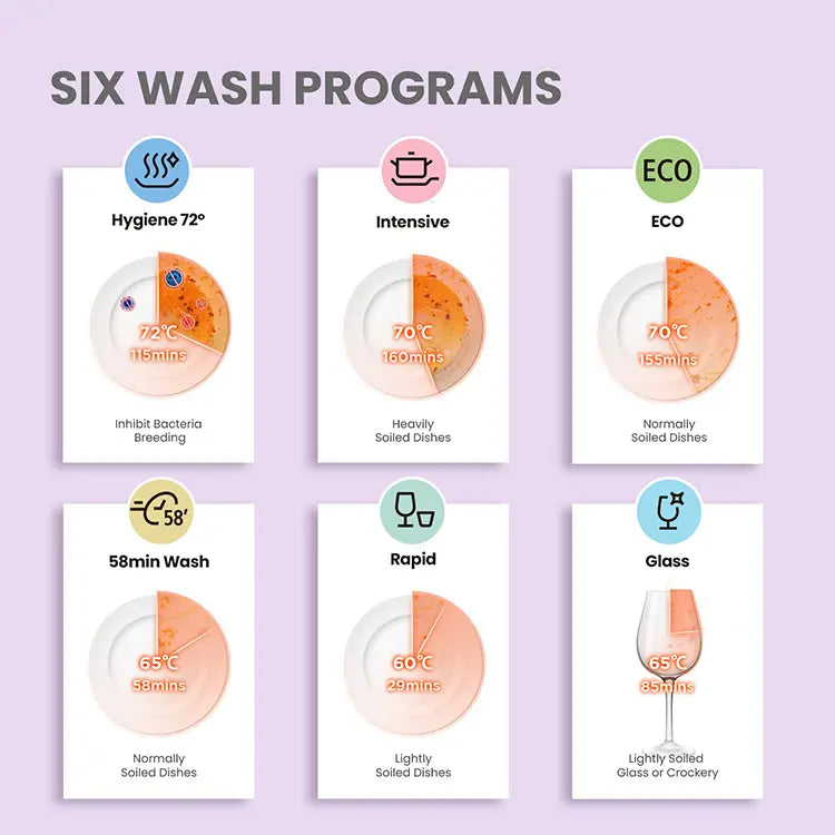 • Autopulizia - Mantiene l'interno della mini lavastoviglie pulito e fresco con il programma di pulizia ad alta temperatura (fino a 70℃) della durata di 65 minuti.