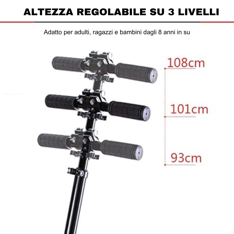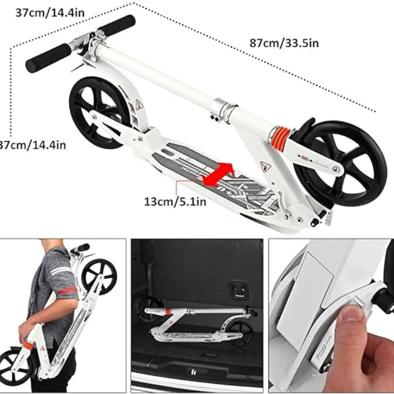 Vi presentiamo il nostro monopattino pieghevole con ripiegamento facilitato, freno e ruote grandi: il massimo della praticità, della sicurezza e delle prestazioni in un design elegante e compatto! Questo monopattino, progettato per bambini e adulti, è dotato di un rivoluzionario sistema di ripiegamento in 3 secondi che lo trasforma senza sforzo in un compagno portatile per le vostre avventure quotidiane. Con una struttura robusta in grado di sostenere fino a 220 libbre, potete fidarvi della sua durata e affidabilità. Il freno a pedale incorporato assicura arresti rapidi e reattivi, mentre le ruote grandi da 200 mm garantiscono una guida fluida e stabile, sia che stiate attraversando il quartiere sia che stiate andando al lavoro o a scuola. Elevate la vostra esperienza di guida con questo monopattino di alto livello, dove la qualità incontra la convenienza per piloti di tutte le età!