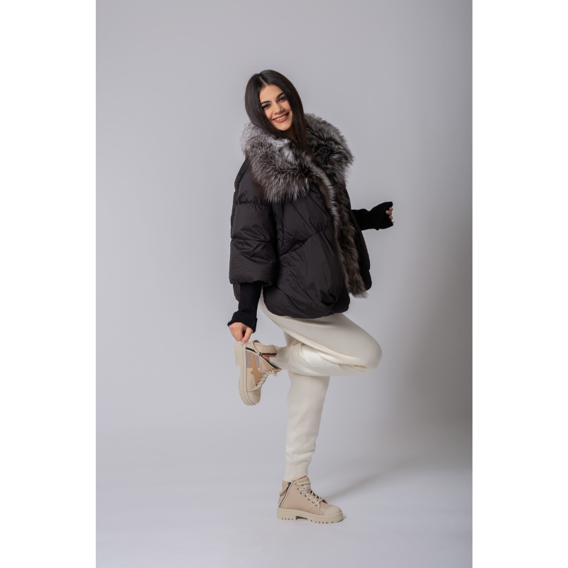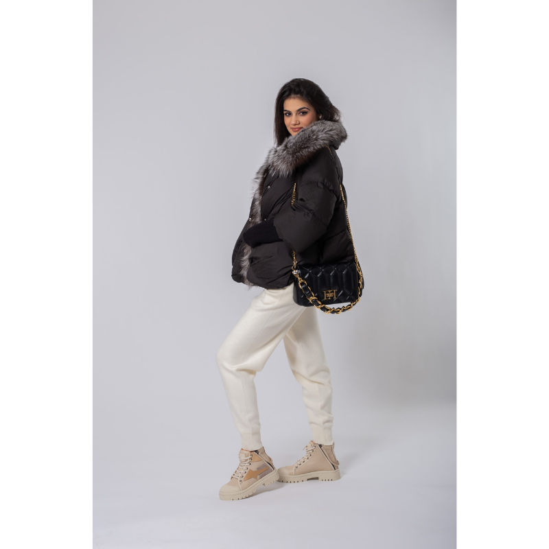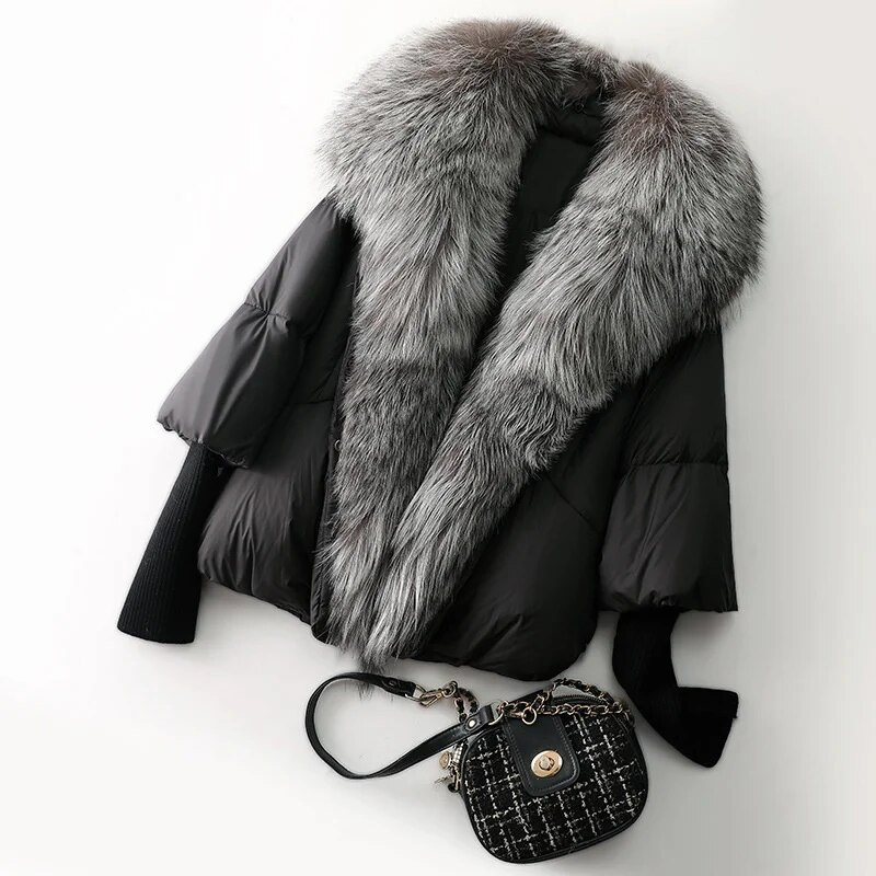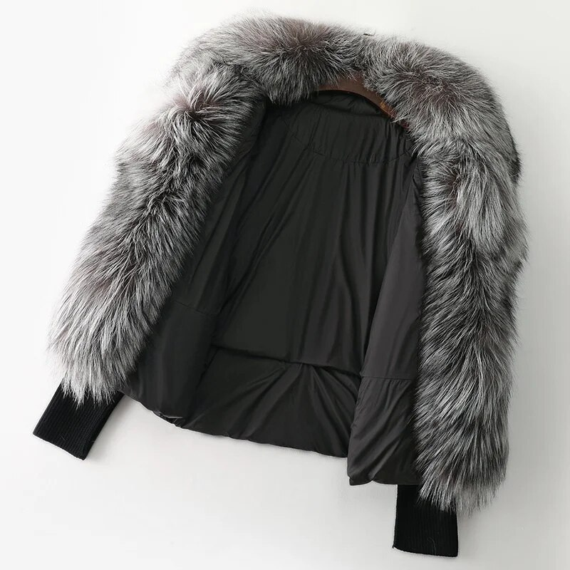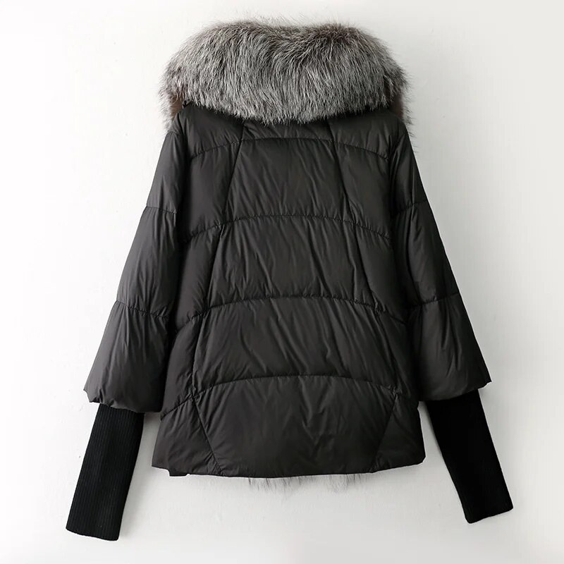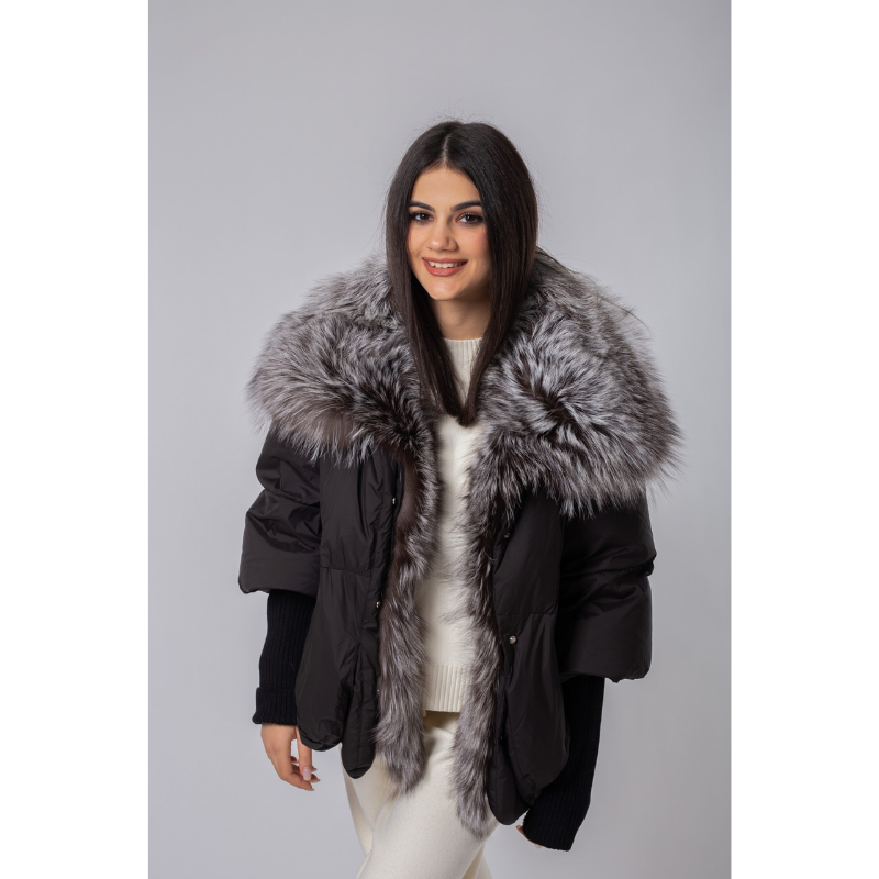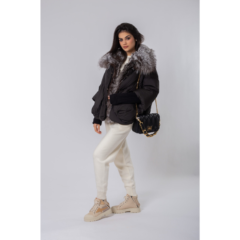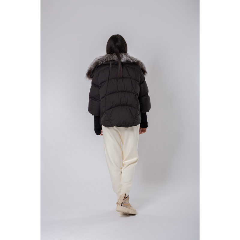 Design Elegante: La fusione del cappuccio in pelliccia di volpe con lo stile piumino crea un look chic e sofisticato.