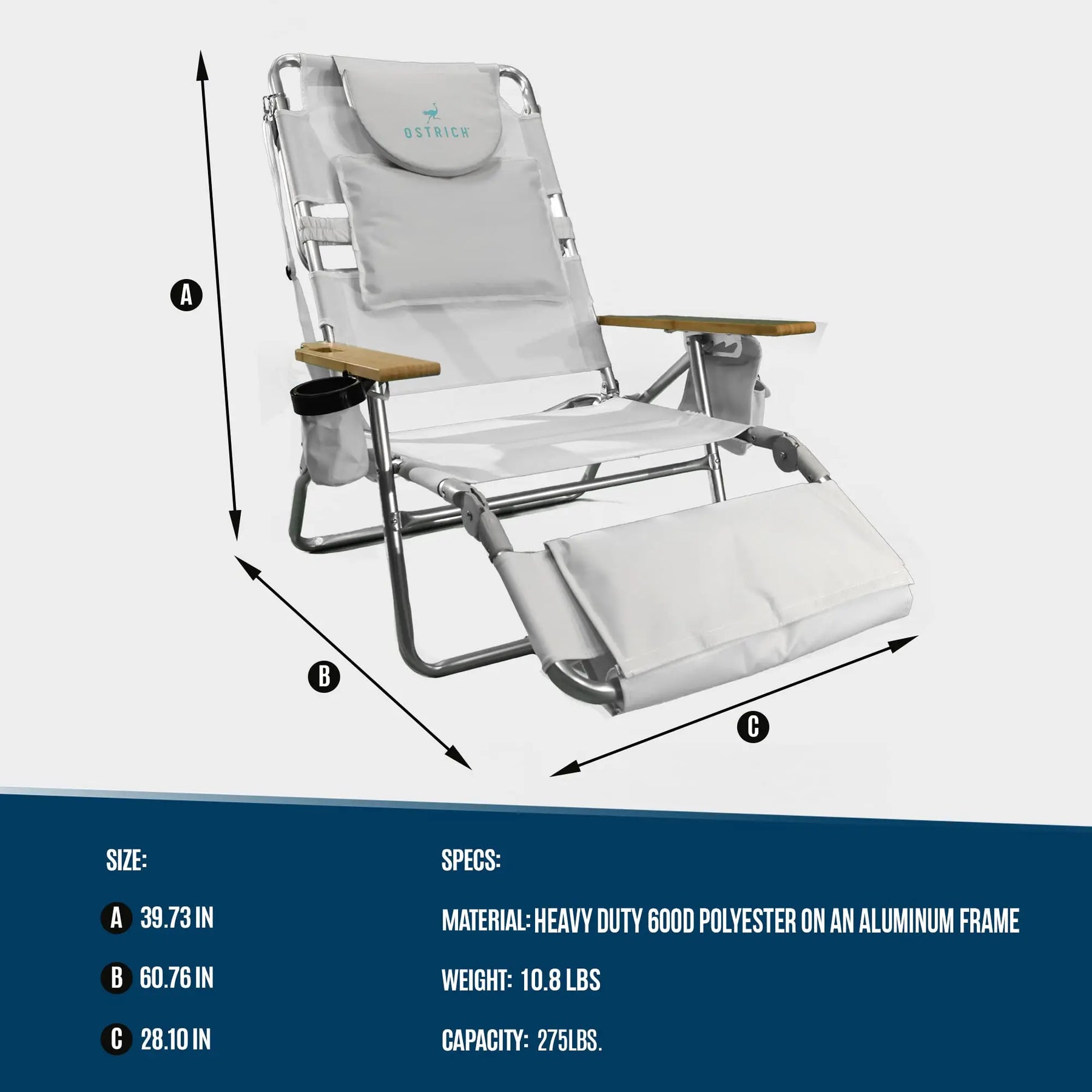 Leggero e resistente alla ruggine, questo lettino è dotato di una cavità facciale aperta o chiusa brevettata con giromanica e cuscino per un'esperienza di cattura delle razze più rilassante che mai. Mettetelo in valigia per la spiaggia, il lago o la lunga passeggiata romantica verso la piscina o il patio.Grazie alla cinghia di trasporto integrata, non dovrete preoccuparvi di scorrere la sabbia o di vagare alla ricerca del punto perfetto per afferrare il vostro bronzo. Può pesare fino a 275 libbre, presenta strisce fresche e può essere ripiegato in 3 posizioni. Avete tutto il tempo per rilassarvi sulla poltrona Ostrich. Quindi non dimenticate a casa il vostro libro o la vostra rivista.
