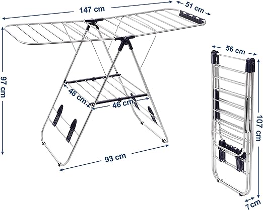 • Grande capacità - Con una dimensione completamente aperta di 147 x 128 x 56 cm (L x A x P), questa asciugatrice ha una lunghezza di asciugatura di 16 m, ideale per circa 2 carichi di macchina; vestiti, biancheria da letto o piumoni possono essere asciugati bene su entrambe le ali di asciugatura; carico massimo dell'asciugatrice: 20 kg