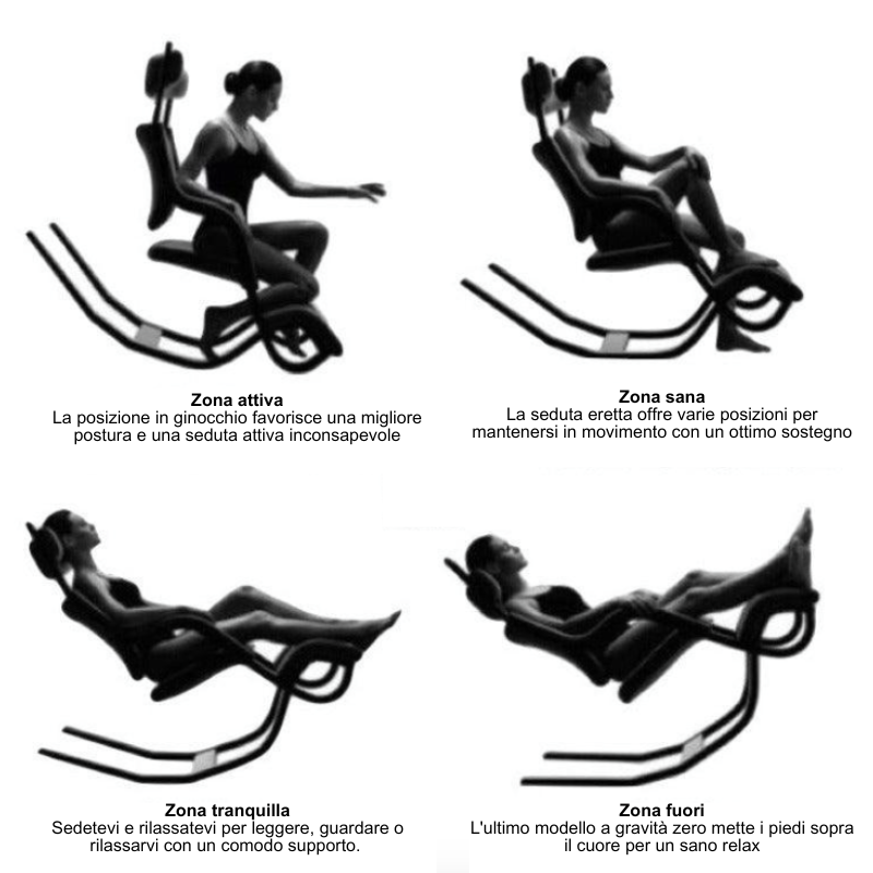 - Il design unico offre 4 posizioni diverse: in ginocchio, in posizione eretta, reclinata e in assenza di gravità.